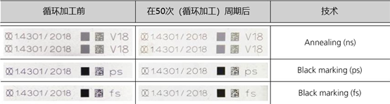 前后通過 50 次循環(huán)加工周期由熱處理和深黑打標的方法制成的標記 實驗結(jié)果證明: 循環(huán)加工后,使用深黑打標用飛秒激光(fs)打印的標記仍然在所有技術(shù)中心對比度最高,隨后是應(yīng)用皮秒激光(ps)的標記。固態(tài)激光器(ns)的打印標記具有較淺的對比度。 標記質(zhì)量對及其可讀的數(shù)據(jù)矩陣代碼(DMC)及其肉眼刻度的字母和標識仍然非常好。 總結(jié) 通快納秒激光器的退火打標和超短脈沖的激光器的深黑打標都可以完美滿足醫(yī)療器械的循環(huán)加工利用的需求。即使經(jīng)過 50 次堿性清潔和蒸汽滅菌的循環(huán)加工過程,激光標識仍然清晰可見,無腐蝕性且可辨識。 (文章轉(zhuǎn)載自網(wǎng)絡(luò),如有侵權(quán),請聯(lián)系刪除)