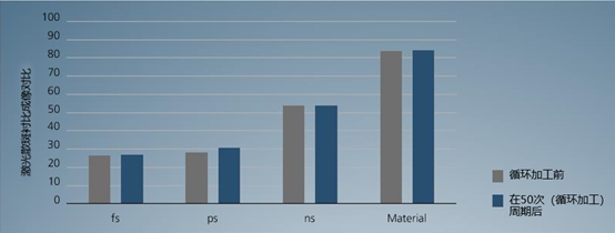 實驗證明 為證明通快打標的高辨識度、可持續(xù)性,我們采用奧氏體鉻鎳1.4301不銹鋼板,經(jīng)過鈍化、清潔與儲存后,用三種不同的激光進行打標,并測量比較了標記在 50 個循環(huán)加工處理周期之前和之后的的對比度。 該三種激光及工序分別為: