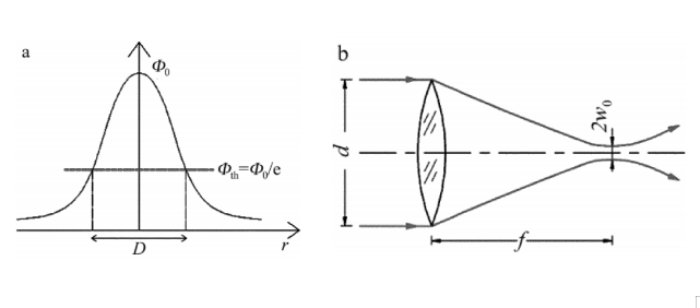 圖3 (a)高斯光束的光強分布圖; (b)高斯光束束腰半徑 即中心能量密度與脈沖能量的關(guān)系為: