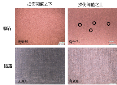 整理得到: 其中上式為一條關(guān)于圖片的直線,其斜率為圖片。 因此根據(jù)材料損傷閾值的定義,激光損傷直徑為零時的能量密度值為激光與材料作用的單脈沖損傷閾值。通過實驗獲得材料的單脈沖損傷直徑與激光功率的對應(yīng)數(shù)據(jù),通過線性擬合就可以推算出材料的單脈沖損傷閾值。 但是在實際的激光清洗過程中,我們更多采用的是光斑搭接多脈沖的形式進(jìn)行表面去除。即還需設(shè)置不同的功率能量密度和脈沖個數(shù),測量出其對材料損傷的孔徑,通過線性擬合得出多脈沖數(shù)下材料損傷閾值。 基于材料的損傷閾值計算原理,我們采用該方法對陽極銅箔和陰極鋁箔進(jìn)行了多脈沖的損傷閾值測試,發(fā)現(xiàn)在低于該值的情況下并不會對箔材造成損傷,滿足新能源鋰電池的使用需求。