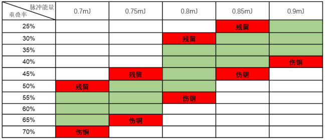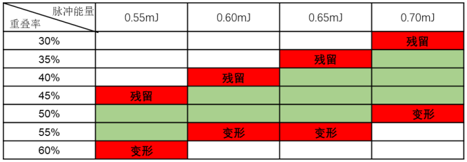 圖4 多脈沖損傷閾值測試 清洗窗口測試 基于以上損傷閾值的測試,表面涂層去除采用兩層清洗的方式,其中以第二層參數(shù)低于損傷閾值為宜。其中還應(yīng)注意的是,在參數(shù)設(shè)置時要保證激光橫向的光斑間距(v/f)與縱向的間距(即填充)保持一致,避免在清洗過程中產(chǎn)生明顯的激光作用條紋。 為此,我們以光斑單脈沖能量和光束重疊率為因子,進(jìn)行多水平參數(shù)的設(shè)置。尋求合適的工藝參數(shù)窗口區(qū)間,保證清洗過后既無涂層的殘留,也不會對箔材造成損傷。 表1 陽極涂層清洗窗口區(qū)間