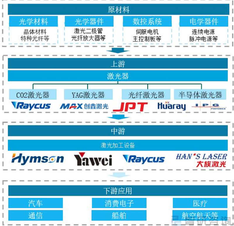 杰普特22日披露,公司被寧德時代選為MOPA脈沖光纖激光器供應(yīng)商。這是國產(chǎn)MOPA激光器開疆拓土的最新案例。 受益于中國制造業(yè)大國地位以及新興產(chǎn)業(yè)的蓬勃發(fā)展,中國中高端激光器廠商最近幾年逐步崛起。 激光加工技術(shù)是利用激光,對(包括金屬與非金屬)進行切割、焊接、表面處理、打孔及微加工等的一門加工技術(shù)。由于激光具有良好的單色性、相干性和方向性,激光加工技術(shù)作為先進制造技術(shù),已廣泛應(yīng)用于汽車、電子、電器、航空、冶金、機械制造等行業(yè)。激光產(chǎn)業(yè)鏈包括上游原材料、激光器件、激光設(shè)備及下游應(yīng)用等。其中,核心部件激光器是能發(fā)射激光的裝置,按工作介質(zhì)分,激光器可分為氣體激光器、固體激光器、光纖激光器和半導(dǎo)體激光器4大類。其中,在中國市占率接近一半的光纖激光器主要應(yīng)用在工業(yè)領(lǐng)域。