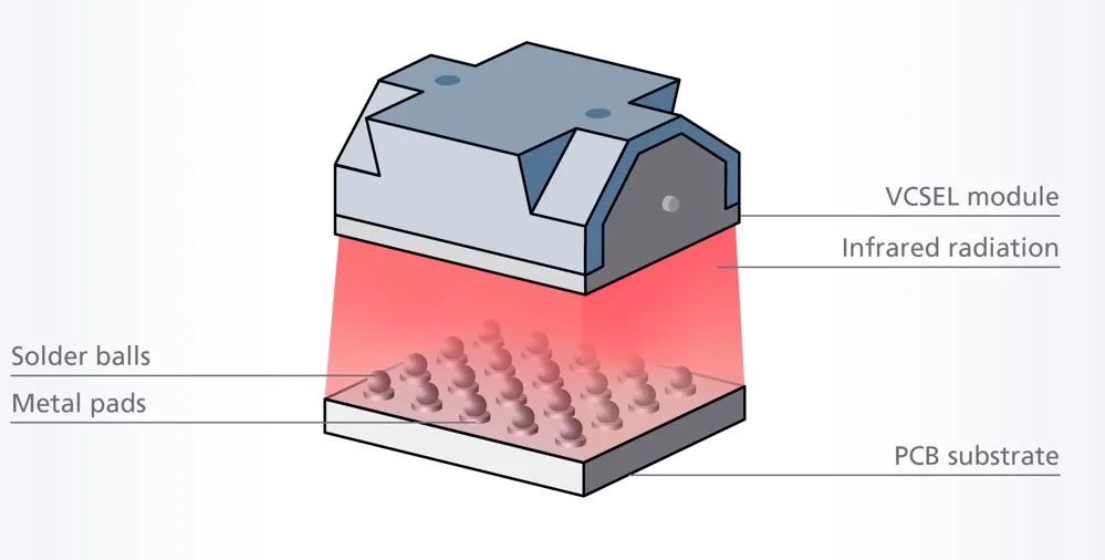 激光輔助鍵合 (LAB) 激光輔助鍵合工藝示意圖。 倒裝芯片被放置在PCB板上,激光能量通過硅片進行傳導以熔化芯片和PCB之間的焊球。