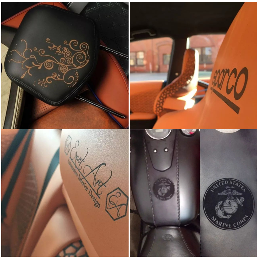 在電腦上制作圖后,激光打標機就會依據(jù)預(yù)設(shè)圖紙在汽車坐墊表面進行局部照射,使得汽車坐墊的表層材料汽化,從而留下所需要的圖案、符號或者文字。