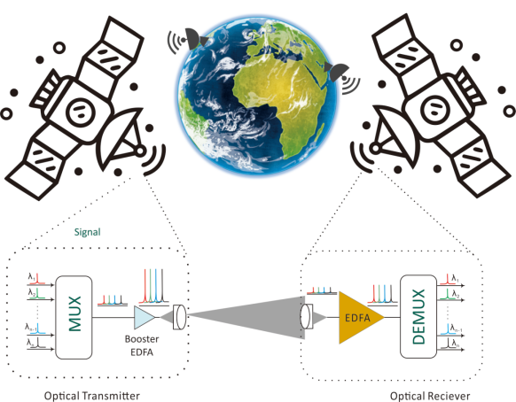 圖1 衛(wèi)星激光通信示意圖 空間激光通信由發(fā)射和接收系統(tǒng)構(gòu)成,發(fā)射端將激光放大到足夠功率,向?qū)Ψ桨l(fā)射被調(diào)制的激光脈沖信號(hào)(聲音或數(shù)據(jù));接收端通過(guò)光學(xué)天線將收集到的光信號(hào)進(jìn)行放大,然后檢測(cè)有用信號(hào),其原理如圖1所示。由于是自由空間光通信,通信鏈路中無(wú)法實(shí)現(xiàn)中繼放大,因此除了要保證比較高的調(diào)制速率外,還需要能有較大的發(fā)射光功率。這就導(dǎo)致半導(dǎo)體激光器在空間通信系統(tǒng)中具有無(wú)法逾越的瓶頸。然而,1550nm光纖激光由于處于現(xiàn)有通信系統(tǒng)波段,可以通過(guò)鉺纖和鉺鐿共摻光纖進(jìn)行放大,輸出功率高,抗干擾能力強(qiáng),因此成為空間激光通信系統(tǒng)首選激光光源。 空間通信距離一般都很遠(yuǎn),因此激光信號(hào)需要放大器進(jìn)行足夠放大,才能將光信號(hào)傳輸?shù)母h(yuǎn)。到達(dá)接收端時(shí),長(zhǎng)距離的傳輸使信號(hào)變得非常微弱,也需要將信號(hào)再次進(jìn)行放大,才能進(jìn)行解調(diào)。因此,摻鉺光纖放大器的出現(xiàn)使1550nm空間激光通信成為可能。隨著空間通信技術(shù)的不斷發(fā)展,摻鉺及鉺鐿共摻光纖放大器憑借寬帶寬、低損耗的光學(xué)性能和輕重量等優(yōu)點(diǎn)受到廣泛關(guān)注,并成功搭載在衛(wèi)星上承擔(dān)空間通信、數(shù)據(jù)傳輸?shù)热蝿?wù),目前其數(shù)據(jù)傳輸速率可達(dá)TB/s量級(jí)成為了1550nm空間激光通信的關(guān)鍵核心器件。 另外,衛(wèi)星空間通信系統(tǒng)多處于太空中,大量輻射粒子嚴(yán)重影響器件的壽命。因此,摻鉺及鉺鐿共摻放大器必須具備抗輻照性能,其嚴(yán)重依賴于抗輻照鉺纖及鉺鐿共摻光纖。國(guó)內(nèi)抗輻照鉺纖及鉺鐿光纖又嚴(yán)重依賴進(jìn)口,這嚴(yán)重制約了我國(guó)空間激光通信的發(fā)展。 抗輻照摻鉺光纖 相比于無(wú)源光纖,摻鉺光纖對(duì)輻照更加敏感,在太空及高能物理設(shè)施等輻射環(huán)境中很容易受到輻照,光學(xué)性能指標(biāo)會(huì)下降,最終影響光器件的正常工作。傳統(tǒng)的物理屏蔽方法雖然可以起到隔離高能量射線的作用,但這種方式存在重量過(guò)高,體積過(guò)大的問(wèn)題,無(wú)法應(yīng)用在現(xiàn)代太空精密設(shè)備中。因此,提升有源光纖自身的抗輻照性能才是解決有源光纖在太空中應(yīng)用難題的有效途徑。 目前的研究表明,輻照時(shí)光纖產(chǎn)生缺陷的機(jī)理主要有兩種:電離損傷和位移損傷。電離損傷是當(dāng)光纖收到輻照時(shí)其中的電子吸收入射粒子能量躍遷到導(dǎo)帶,同時(shí)在價(jià)帶中產(chǎn)生對(duì)應(yīng)空穴,即電子-空穴對(duì)。位移損傷是當(dāng)輻照引入到光纖基質(zhì)中的粒子能量足夠大時(shí),高能粒子會(huì)導(dǎo)致 Si 或者 O 原子位移從而形成相關(guān)缺陷。由于產(chǎn)生位移損傷所需能量高于電離損傷,所以電離損傷是引起有源光纖輻照損傷的主要機(jī)制。光纖通過(guò)輻照后,會(huì)導(dǎo)致光纖產(chǎn)生輻照損耗,降低系統(tǒng)的增益提高光纖的背景損耗,這些都會(huì)導(dǎo)致光學(xué)系統(tǒng)處于不穩(wěn)定狀態(tài)甚至無(wú)法正常工作。 抗輻照摻鉺光纖技術(shù) 長(zhǎng)進(jìn)激光采用鈰離子摻雜技術(shù)消除輻照產(chǎn)生的色心,通過(guò)調(diào)控鋁和鈰的摻雜濃度和比例提升光纖的抗輻照性能,利用鑭離子降低鉺離子團(tuán)簇效應(yīng),提升光纖效率,最終制備出了具有良好抗輻照性能的摻鉺光纖,其中Er3+的摻雜濃度約為1.9×1025 (Ions/m3),所制備光纖纖芯和包層的直徑分別為9μm和125μm?紤]到真實(shí)太空環(huán)境下的輻照劑量處于102 ~105 Gy量級(jí)之間,因此選擇了1500Gy輻照劑量與0.2Gy/s的劑量率來(lái)測(cè)試抗輻照摻鉺光纖的輻致?lián)p耗與輻致增益變化。圖2為抗輻照摻鉺光纖截面圖。