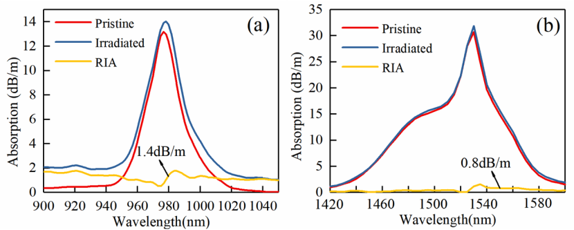 圖2 抗輻照摻鉺光纖截面 圖3為C波段抗輻照摻鉺光纖在輻照前與經(jīng)過(guò)1500Gy劑量輻照后的吸收譜以及相應(yīng)的輻致?lián)p耗譜。其中圖3(a)為泵浦波段,圖3(b)為信號(hào)波段。吸收譜均使用PHOTON KINETICS 2500吸收譜測(cè)試儀進(jìn)行截段法測(cè)試。輻致?lián)p耗譜由輻照后與輻照前的吸收譜作差得到,在常用的泵浦吸收波段980nm的輻致?lián)p耗約為1.4dB/m,在C波段信號(hào)1550nm處的輻致?lián)p耗約為0.8dB/m。