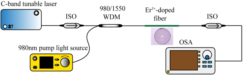 圖3抗輻照摻鉺光纖的原始光纖吸收譜、輻照光纖吸收譜以及對(duì)應(yīng)的輻致?lián)p耗。(a)泵浦波段;(b)信號(hào)波段 圖4為C波段抗輻照摻鉺光纖的增益測(cè)試結(jié)構(gòu)圖。采用典型的前向泵浦EDFA結(jié)構(gòu),WDM(Wavelength Division Multiplexing)為波分復(fù)用,ISO(Isolator)為隔離器。信號(hào)光源采用可調(diào)諧C波段光源,泵浦源采用高穩(wěn)定性980nm泵浦源,原始與輻照后的摻鉺光纖測(cè)試長(zhǎng)度均為2.7m。實(shí)驗(yàn)中將原始光纖與輻照后的光纖分別接入增益測(cè)試系統(tǒng)進(jìn)行測(cè)試,采用功率為-20dBm的1550nm信號(hào),將980nm泵浦源的功率由50mw逐步提升至550mw,同時(shí)記錄摻鉺光纖的增益水平。增益測(cè)試結(jié)果均由橫河AQ6370D光譜儀測(cè)得。