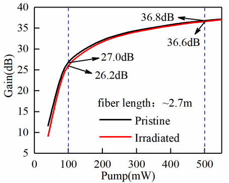 圖4 C波段抗輻照摻鉺光纖增益測(cè)試系統(tǒng)與光纖截面 圖5為C波段抗輻照摻鉺光纖在輻照前后的增益隨泵浦變化曲線。原始光纖在100mw泵浦條件下的增益為27dB,1500Gy輻照光纖在同等條件下的增益為26.2dB,兩者作差得到輻致增益變化為僅0.8dB。隨著泵浦功率的提升,光纖逐步接近增益飽和。由于泵浦漂白作用,在泵浦功率為500mW時(shí),原始光纖增益達(dá)到36.8dB,輻照光纖增益為36.6dB,輻致增益變化減小到0.2dB。