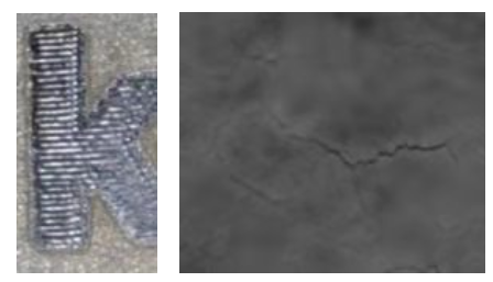 激光黑色標記的耐腐蝕性 皮秒激光 OR 納秒激光 在醫(yī)療器械行業(yè)中,耐腐蝕性是一個重要的指標,測試耐腐蝕性的一般操作方法是將鐳雕的金屬放入一定濃度鹽霧環(huán)境一定的時間后,取出放大觀測鐳雕區(qū)域的情況,在經(jīng)過耐腐蝕測試后,可能會出現(xiàn)印記脫落或是激光標記區(qū)域生銹的問題。但是通過激光器的選型、工藝參數(shù)的調(diào)整,可達到激光黑色標記耐腐蝕的最佳效果。 常見的不銹鋼呈現(xiàn)為銀白色,通過激光標記而著色的不銹鋼可保持原有的良好性能,使它的用途更廣。在激光打標中,納秒激光和超快激光打黑原理不同。納秒激光打標一般生成包括黑色在內(nèi)的有顏色的氧化物,皮秒激光則是由于生成了納米結(jié)構(gòu)不反射光形成視覺上的黑色效果。 在不銹鋼激光打彩的實際應用中,彩色打標效果調(diào)試較難,通過調(diào)節(jié)頻率、脈寬、離焦量等可生成黑色等不同的顏色,在參數(shù)設(shè)置一定的情況下,隨著激光器、振鏡和場鏡等的更換,呈現(xiàn)出來的顏色也會出現(xiàn)差異。 一般的納秒激光器打黑標記后生成黑色氧化物層,熱效應導致裂紋產(chǎn)生,氧化層具有易脆性,如圖1納秒激光打標樣品圖,放大顯示出氧化層的裂紋狀態(tài),這些裂紋使標記在鹽霧過程中會褪色或者銹蝕。