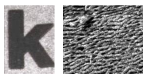 圖1 納秒激光打標樣品及局部放大圖 使用皮秒激光脈沖打標會在表面上留下充足的鉻(大約 20 個左右的原子層),將氧化膜替換為鉻,從而保持了耐腐蝕性,例如以亞鉻酸鹽或鉻鐵尖晶石的形式存在。因此即使經(jīng)過多次、長時間的腐蝕測試,黑色標記也不會顯示出由于腐蝕引起的損傷,并且保持清晰可見;其次,標記完成以后形成精細的、周期性均勻的波紋結(jié)構(gòu),使用掃描電子顯微鏡可觀測到,這些納米結(jié)構(gòu)呈最小化,通過“光阱效應”直接反射并散射了光,從而呈現(xiàn)一種啞光黑色。 如圖2皮秒激光器黑色打標樣品圖,放大特寫圖顯示了激光打標結(jié)構(gòu)具有周期、精細、均勻的形態(tài),具有“光阱”特性。