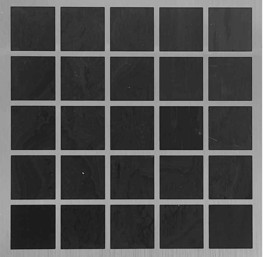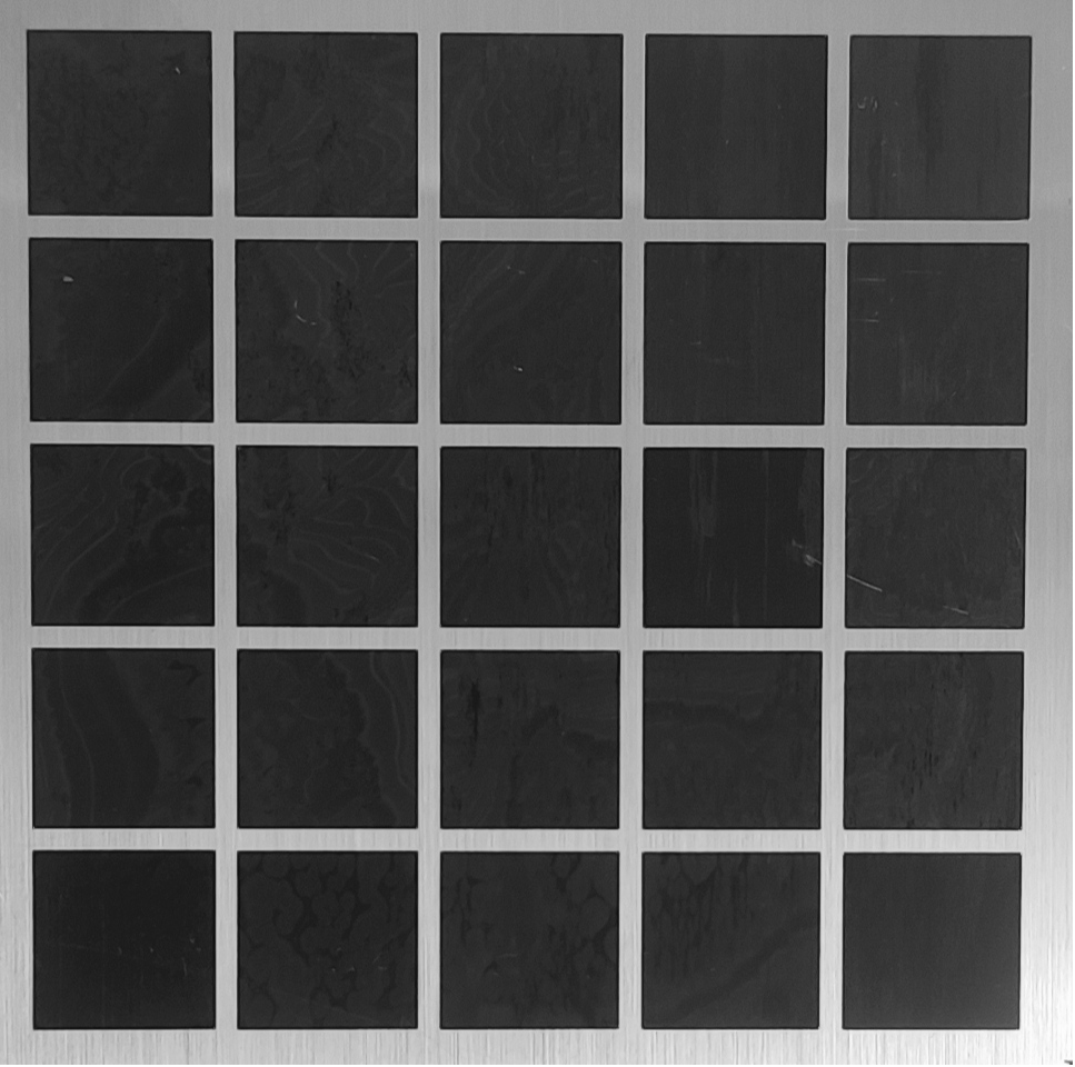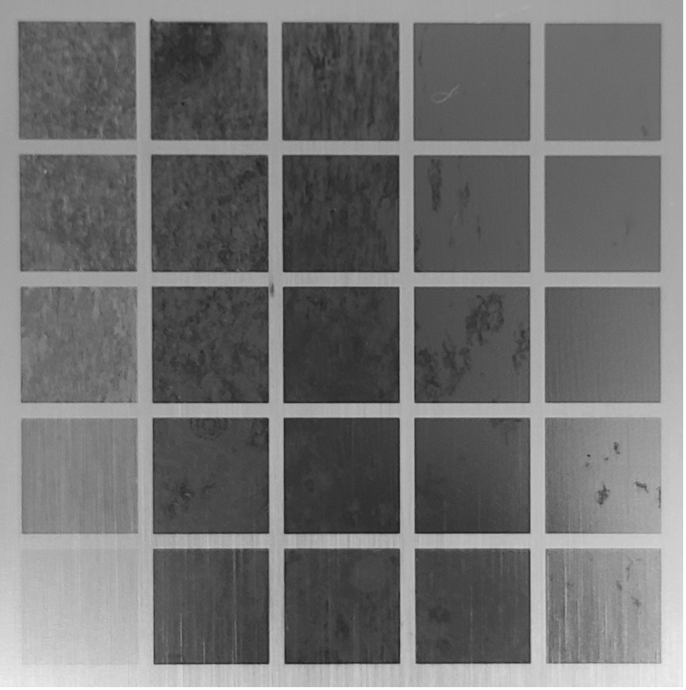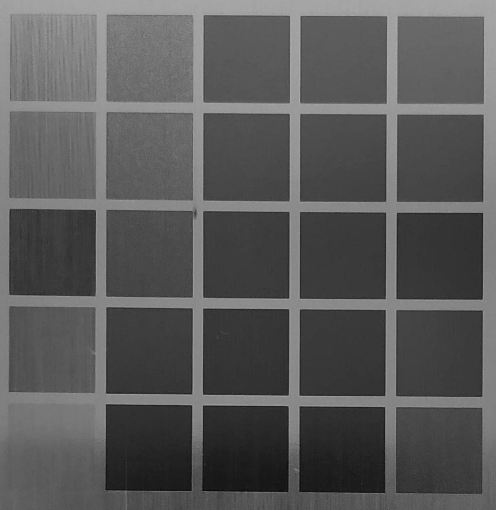 皮秒激光器打黑窗口較寬,打黑效果較好,鹽霧實驗前參數(shù)組合在300系列不銹鋼上打標效果如圖5所示: