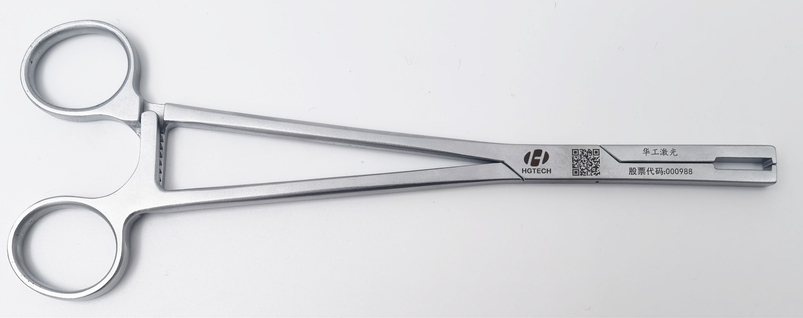 圖6 皮秒激光打黑鹽霧實驗后 醫(yī)療行業(yè)不同場景對不同系列的不銹鋼都有應用,從測試400系列和600系列打標后鹽霧試驗測試情況看,400系列和600系列不銹鋼材料鹽霧后,未打標區(qū)域都已經(jīng)銹跡斑斑,說明兩種材料本身的耐腐蝕性能都比較差;通過鹽霧試驗也可以發(fā)現(xiàn),激光能量輸出生成黑色氧化物的區(qū)塊,耐腐蝕性能優(yōu)于未打標區(qū)域,激光使得不銹鋼表面形成氧化膜,保護內(nèi)部金屬不被腐蝕;為了提高400和600系列不銹鋼材料本身的耐腐蝕性,一般需經(jīng)過真空失效熱處理→達到要求硬度→酸洗去氧化皮→磨平表面處理至規(guī)定Ra→清洗→噴砂→鈍化等一系列處理后使材料本體實現(xiàn)耐腐蝕;200系列和300系列不銹鋼本體耐腐蝕性能較佳,一般不做前處理可直接進行激光標記。 醫(yī)療器械“智造”之解 皮秒脈沖激光標記技術(shù) 自美國和歐盟引入了 UDI(Unique Device Identification)標準,醫(yī)療行業(yè)在其產(chǎn)品可追溯性方面面臨更高的要求。對于醫(yī)療行業(yè)外科醫(yī)用不銹鋼材料而言,這意味著要創(chuàng)建清晰易讀而且耐腐蝕的標記,這種標記最好呈現(xiàn)黑色效果,標記完成后即使經(jīng)過多次清潔與消毒循環(huán)之后也可以在后續(xù)的日常臨床工作中保持其高質(zhì)量水平。 由上面實驗可以看出,使用皮秒脈沖激光進行黑色標記非常適合加工黑色啞光、耐腐蝕的標記,這種標記將在臨床使用中長時間保持穩(wěn)定清晰。 皮秒激光在醫(yī)療手術(shù)鉗上和消融針上打黑色標記如圖7所示: