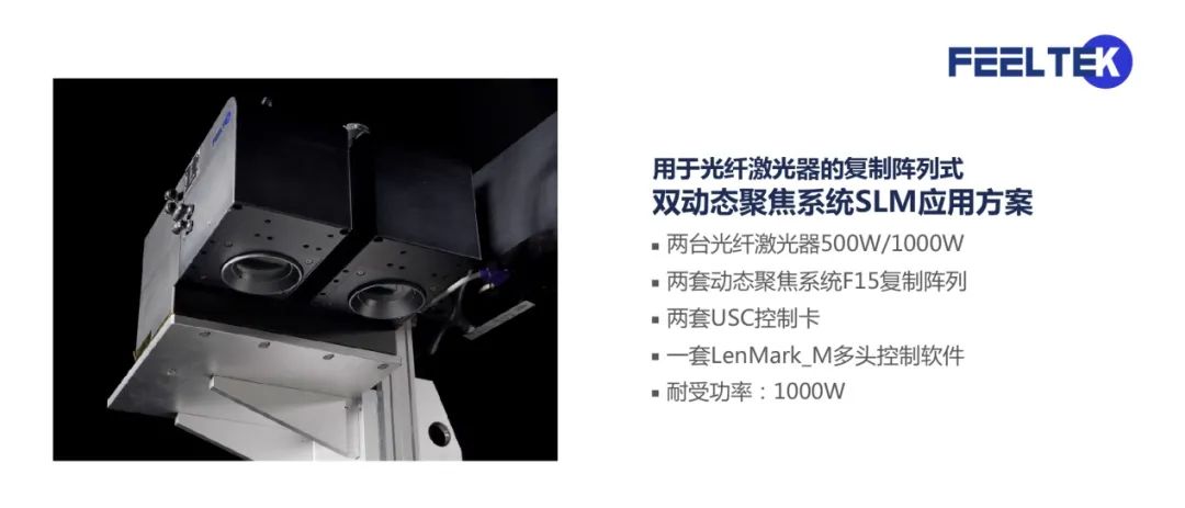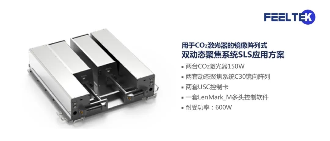 △基于FR15-F(F15)的動(dòng)態(tài)聚焦系統(tǒng)組成 SLS和SLM市場(chǎng)隨著材料工藝的更新和應(yīng)用流行,產(chǎn)業(yè)規(guī)模發(fā)展迅速,迎來爆發(fā)式增長(zhǎng)的機(jī)會(huì),產(chǎn)業(yè)格局基本形成,工業(yè)級(jí)增材制造正在成為主流方向。提高加工效率也成為全球各大廠商追逐的目標(biāo)。 增加打印頭的數(shù)量無疑是最直接有效的方式,目前市面上有看到包括SLM Solutions在內(nèi)的很多公司推出了最多12激光器的3D打印裝備;趧(dòng)態(tài)聚焦系統(tǒng)的多頭3D打印裝備目前以雙激光和四激光的比較常見。 菲鐳泰克基于CO2激光器的雙頭并列式SLS 打印系統(tǒng)方案包含鏡像的兩臺(tái)C30動(dòng)態(tài)聚焦系統(tǒng),兩根150W CO2激光器,兩套板卡和一套雙頭控制軟件。