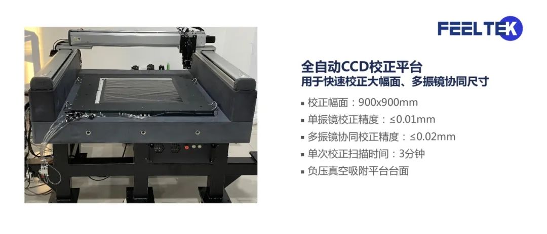 △基于光纖激光器的四頭自標(biāo)定動(dòng)態(tài)聚焦方案 此外,隨著更大的加工幅面和多頭拼接的方案的大量應(yīng)用,3D打印頭的尺寸校正問題越來越凸顯。通常,工作人員需要花費(fèi)將近兩周、甚至更長(zhǎng)的時(shí)間在一套多振鏡激光設(shè)備上的尺寸校正上。 作為工業(yè)激光3D動(dòng)態(tài)聚焦系統(tǒng)領(lǐng)跑者,菲鐳泰克一直致力于推動(dòng)多頭振鏡加工工藝的完善,在不斷提升振鏡加工精度的同時(shí),針對(duì)大幅米和多頭振鏡協(xié)應(yīng)用尺寸校正難題,開發(fā)了“全自動(dòng)CCD校正平臺(tái)”。