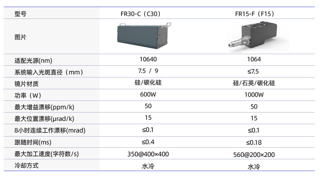 △搭載遠(yuǎn)心場(chǎng)鏡的后聚焦動(dòng)態(tài)聚焦系統(tǒng)方案示意圖 C30和F15 參數(shù)列表