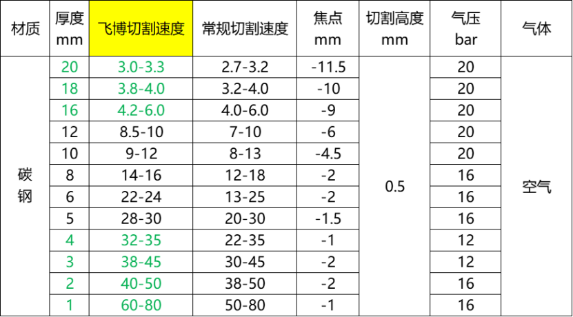 紅色部分為厚板切割數(shù)據(jù) 從上表可以看出,碳鋼氧氣切割,目前測試厚度已經(jīng)達(dá)到了70mm,切割速度提升20%以上。50mm及以下厚度切割速度比肩或高于市場水平。 碳鋼空氣切割