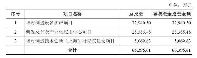 圖片來源:公司招股書 財務(wù)數(shù)據(jù)顯示,公司2019年、2020年、2021年營收分別為1.55億元、2.17億元、3.34億元;同期對應(yīng)的歸母凈利潤分別為1795.05萬元、4096.15萬元、1.17億元。 本次募集資金用于項目及擬投入的募資金額為:增材制造設(shè)備擴產(chǎn)項目,募集資金投資金額約3.29億元;研發(fā)總部及產(chǎn)業(yè)化應(yīng)用中心項目,募集資金投資金額約2.84億元;增材制造技術(shù)創(chuàng)新(上海)研究院建設(shè)項目,募集資金投資金額5069.63萬元。