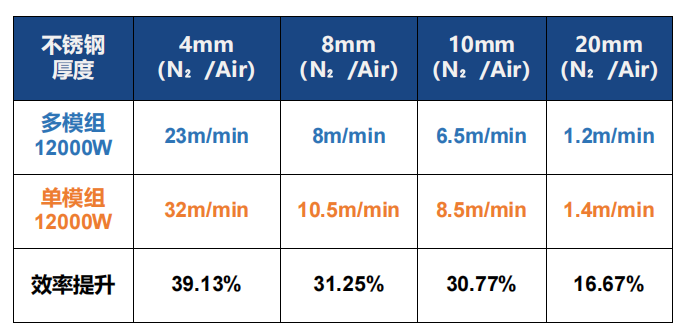 單模組和多模組萬瓦光纖激光器光束圖對比 (上2為單模組,下2為多模組) 單模組萬瓦激光器的優(yōu)勢在中薄板切割速度,以銳科單模組12000和多模組12000激光器進行對比,在20mm以下不同厚度的不銹鋼輔助氮氣或空氣切割條件下,單模組12000切割效率優(yōu)于多模組12000光纖激光器。