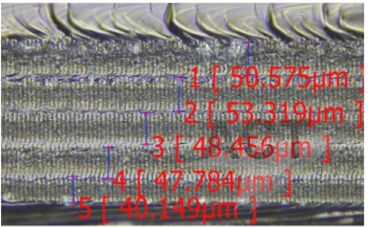多焦點鏡頭,顧名思義,能實現(xiàn)對于單一的入射光束,在傳播方向上不同的距離上,得到不同的焦點。下圖中,為5焦點元件配合聚焦鏡使用在藍寶石加工時的截面圖,其焦點之間的距離基本保證一致,能量不均勻性保持在6%以內。
